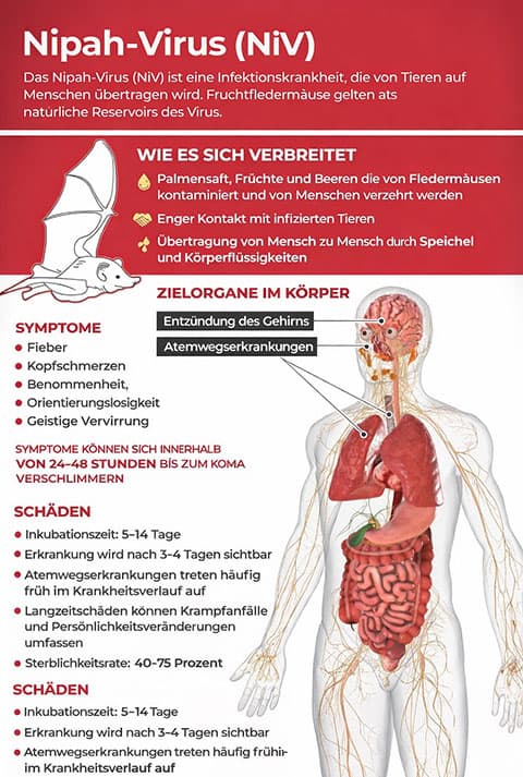 Medizinisch verläuft eine Nipah-Infektion oft schwer. Anfangs zeigen sich unspezifische Beschwerden wie Fieber und Kopfschmerzen. In schweren Fällen kann sich die Erkrankung rasch zu einer akuten Gehirnentzündung entwickeln, begleitet von neurologischen Ausfällen und schweren Atemwegserkrankungen.